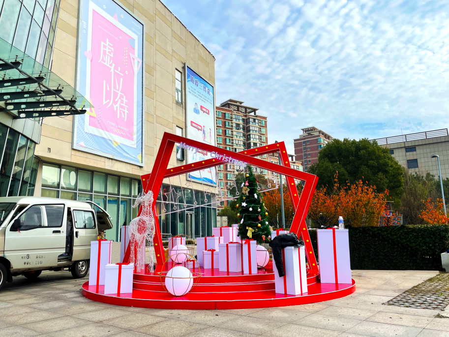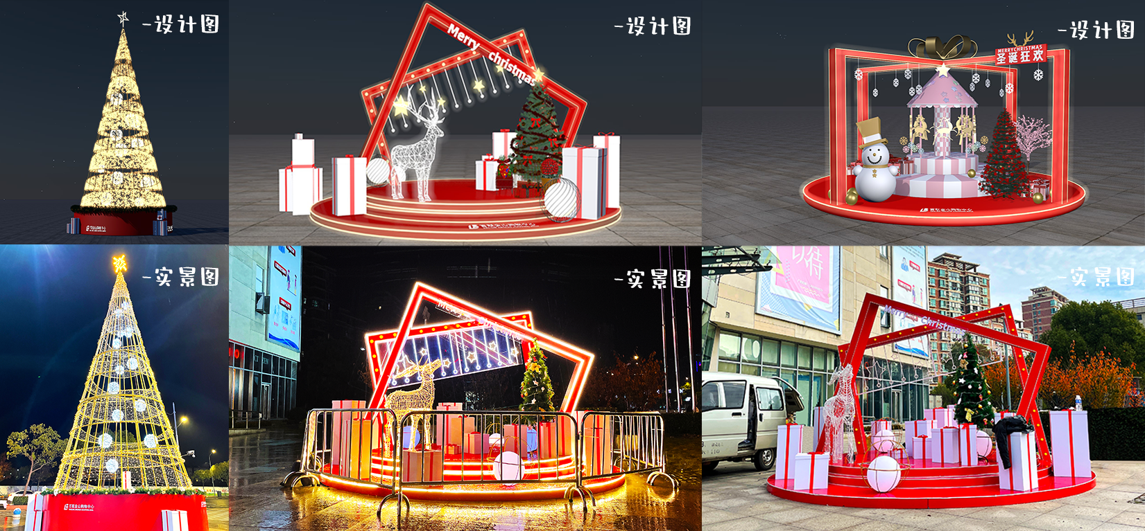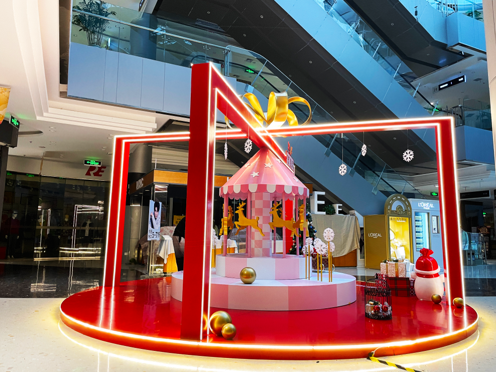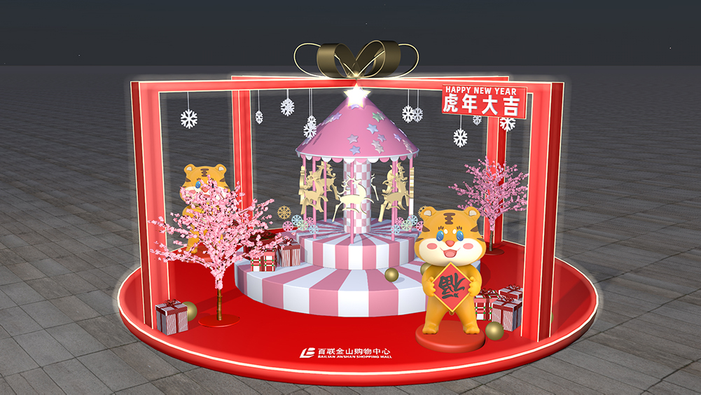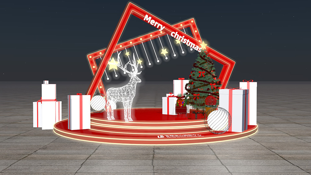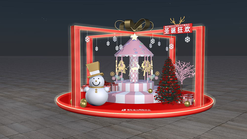 以方形禮盒方形設(shè)計為主,外觀以禮盒的邊面呈現(xiàn)。再加上上方巨大的結(jié)帶,給人在視覺上呈現(xiàn)出禮物盒的效果。除此之外,中間還擺放了粉色系的旋轉(zhuǎn)木馬,大大增加了活動的趣味性和互動性,并且十分切合“禮遇”圣誕的主題。另一側(cè)的雪人也是個活寶,可以吸引很多小孩子前來拍照留念。而下方印有l(wèi)ogo,在分享照片的同時,使我們的品牌知名度傳播的更加廣泛。