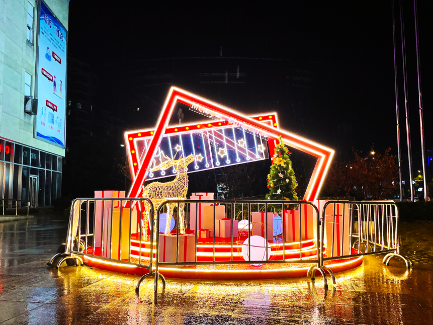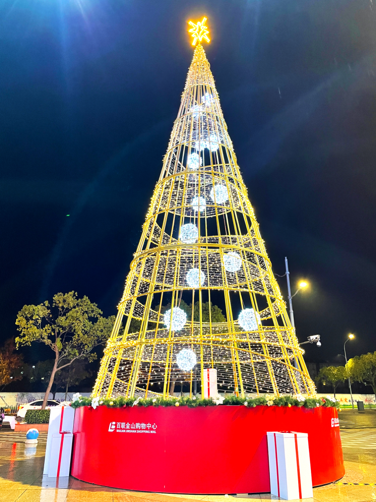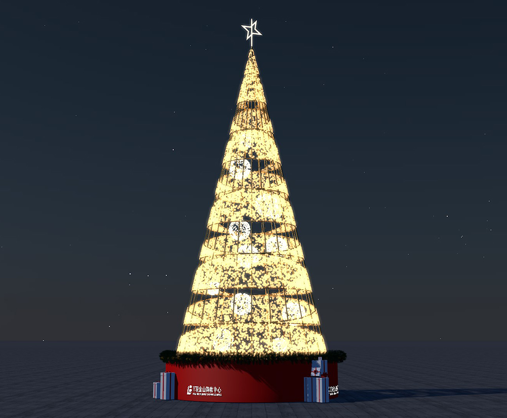 圣誕樹主體高度為12米,給人以仰望與祝愿的氛圍。燈光色系比較簡潔,主體為金屬鋼架結(jié)構(gòu),使用不規(guī)則的形狀片面式的點燈的亮化來呈現(xiàn)圣誕樹主體的基本架構(gòu),中間再輔以白光燈球,與外圍形成對比,來豐富主體的細(xì)節(jié)。