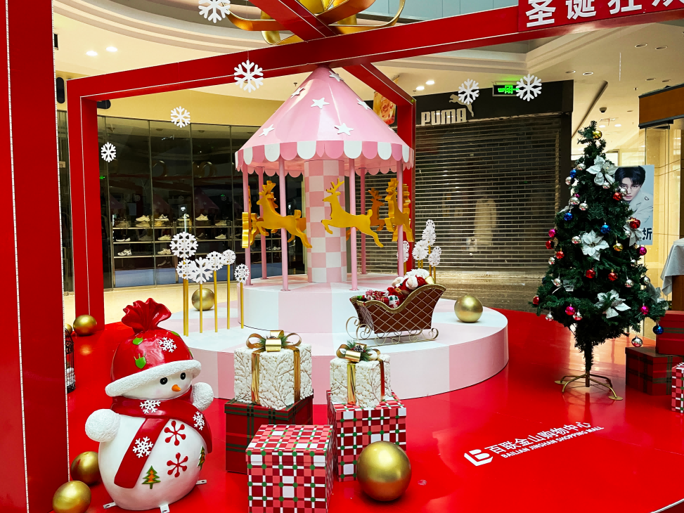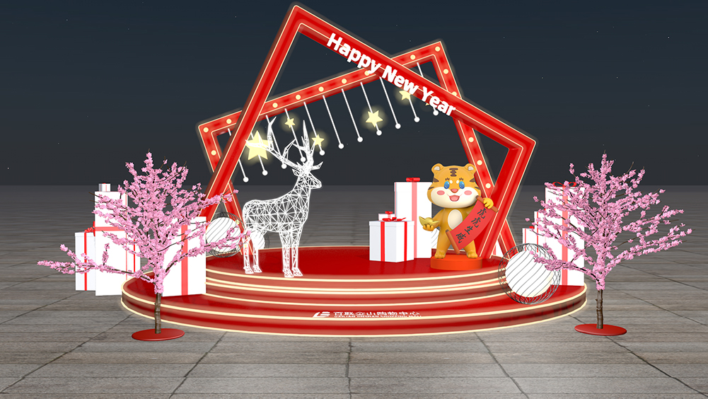 結(jié)合圣誕主題元素進(jìn)行設(shè)計.首先是以一只發(fā)光的小鹿在遙望著圣誕樹,下面有裝禮物的小車,周邊充滿了禮品,給予“神秘的幻想”。整體色調(diào)以白紅色為主,輔以閃閃動人的光效,既襯托了圣誕氛圍;又增加增添活潑可愛的氛圍;還能與百聯(lián)金山購物中心Logo色首尾呼應(yīng)。