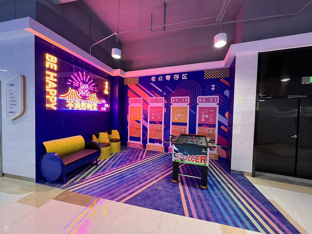●以加油站為概念原型,把通道打造汽車加油站主題的男性休息區(qū),增加趣味性